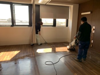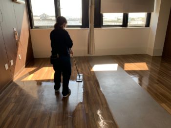 ワックス掛けだけではなく、まずは床の除菌洗浄作業から行っていきます!!
